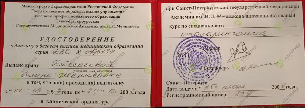 В 2002 году окончила ординатуру при Санкт-Петербургской государственной медицинской академии им. И.И. Мечникова. Специальность: «Оториноларингология».