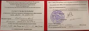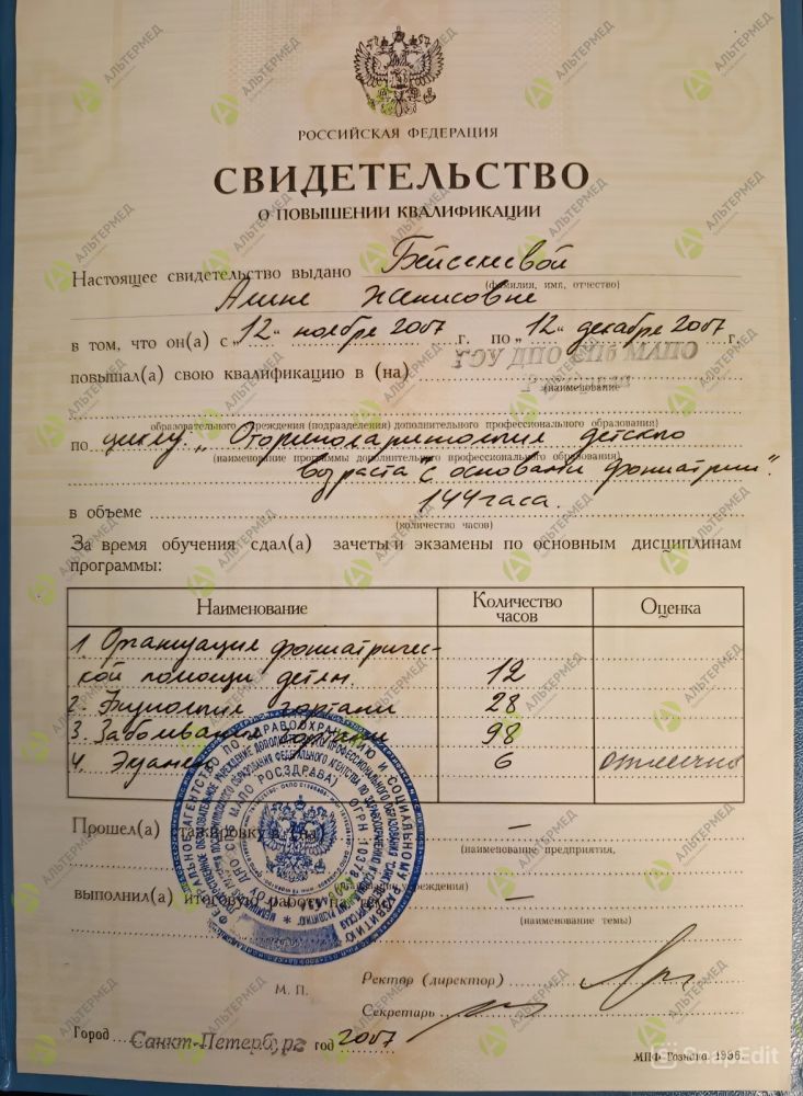2018 г. - повышение квалификации «Отоларингология детского возраста», Санкт‑Петербургская медицинская академия последипломного образования.