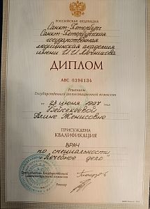 В 1997 году окончила ФГБОУ ВО «Санкт-Петербургская государственная медицинская академия им. И.И. Мечникова» Специальность: «Лечебное дело»
