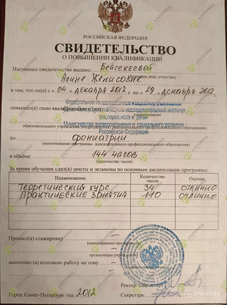 2025 г. - повышение квалификации по программе дополнительного профессионального образования «Оториноларингология», Российская Медицинская академия Непрерывного Профессионального Образования (РМАНПО).