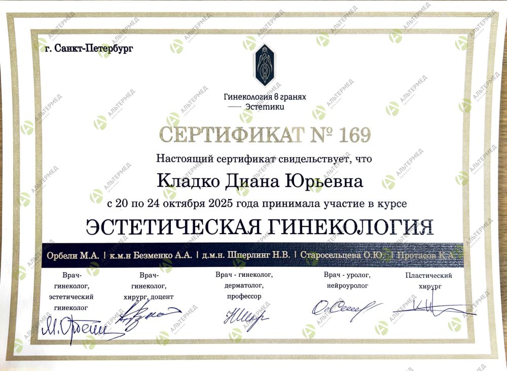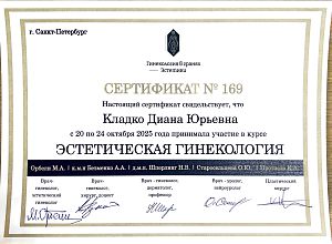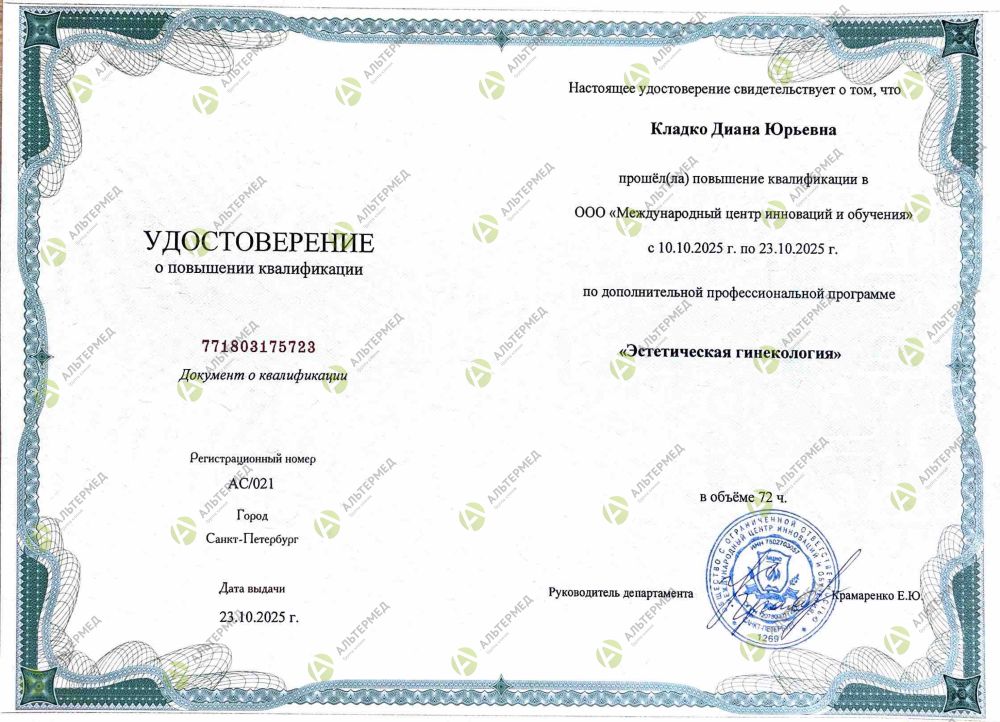 2025 г. – повышение квалификации по дополнительной профессиональной программе «Эстетическая гинекология».