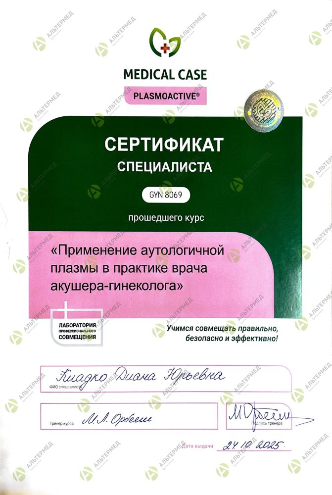 2025 г. – прохождение курса «Применение аутологичной плазмы в практике врача акушера-гинеколога».