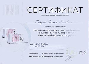2025 г. – участие в семинаре на тему: Интимная контурная пластика с применением филлеров REPARт*G современные техники для безупречного результата.